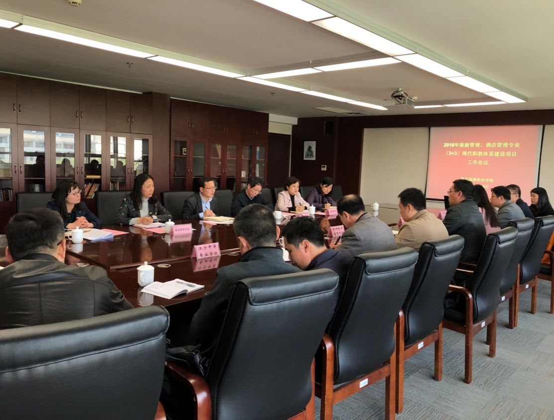 49日上午10点,我校在行政楼411会议室召开2018年旅游管理、酒店管理专业(3+3)现代职教体系建设申报工作会议。校长周春林、教务处副处长孙爱民、酒店管理学院院长洪涛、副院长苏玮、旅游管理学院院长孙斐、副院长金丽娇、合作院校负责人、项目具体负责人等出席了会议,会议由教务处副处长孙爱民主持。
