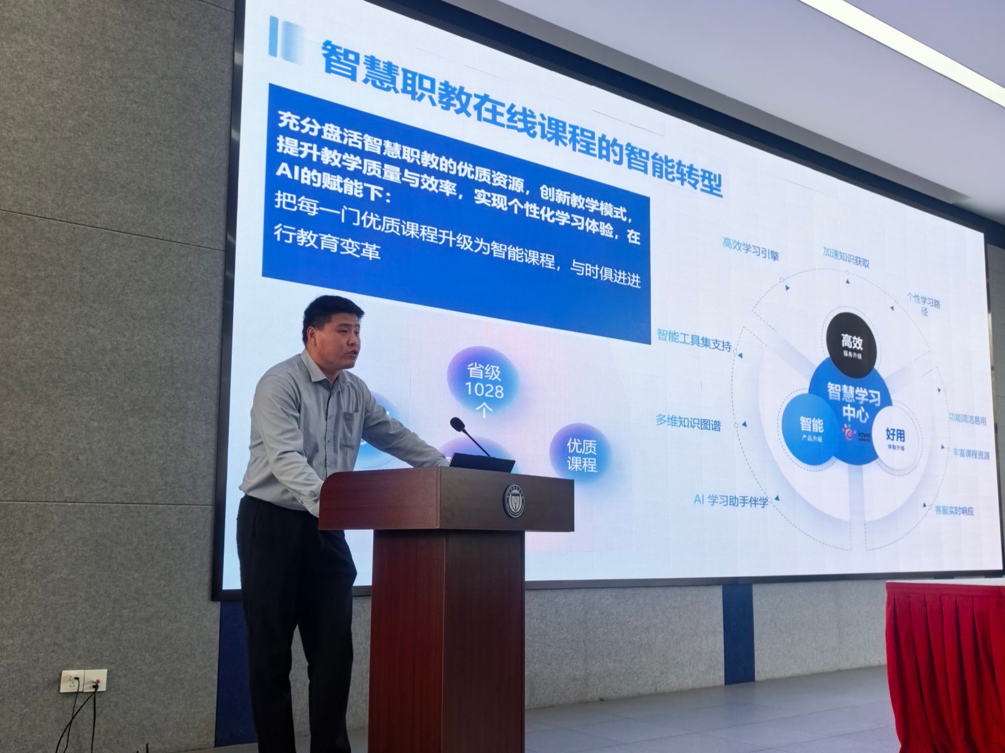第二阶段,智慧职教江苏中心负责人田仁岩主任围绕“基于智慧职教平台的AI课程建设”为主题,聚焦平台核心功能与AI技术应用,通过智能课件生成、知识图谱构建、混合式教学设计等实操演示,引导教师将AI技术融入课堂教学全过程,助力教师打破技术壁垒,提升数字化教学能力。