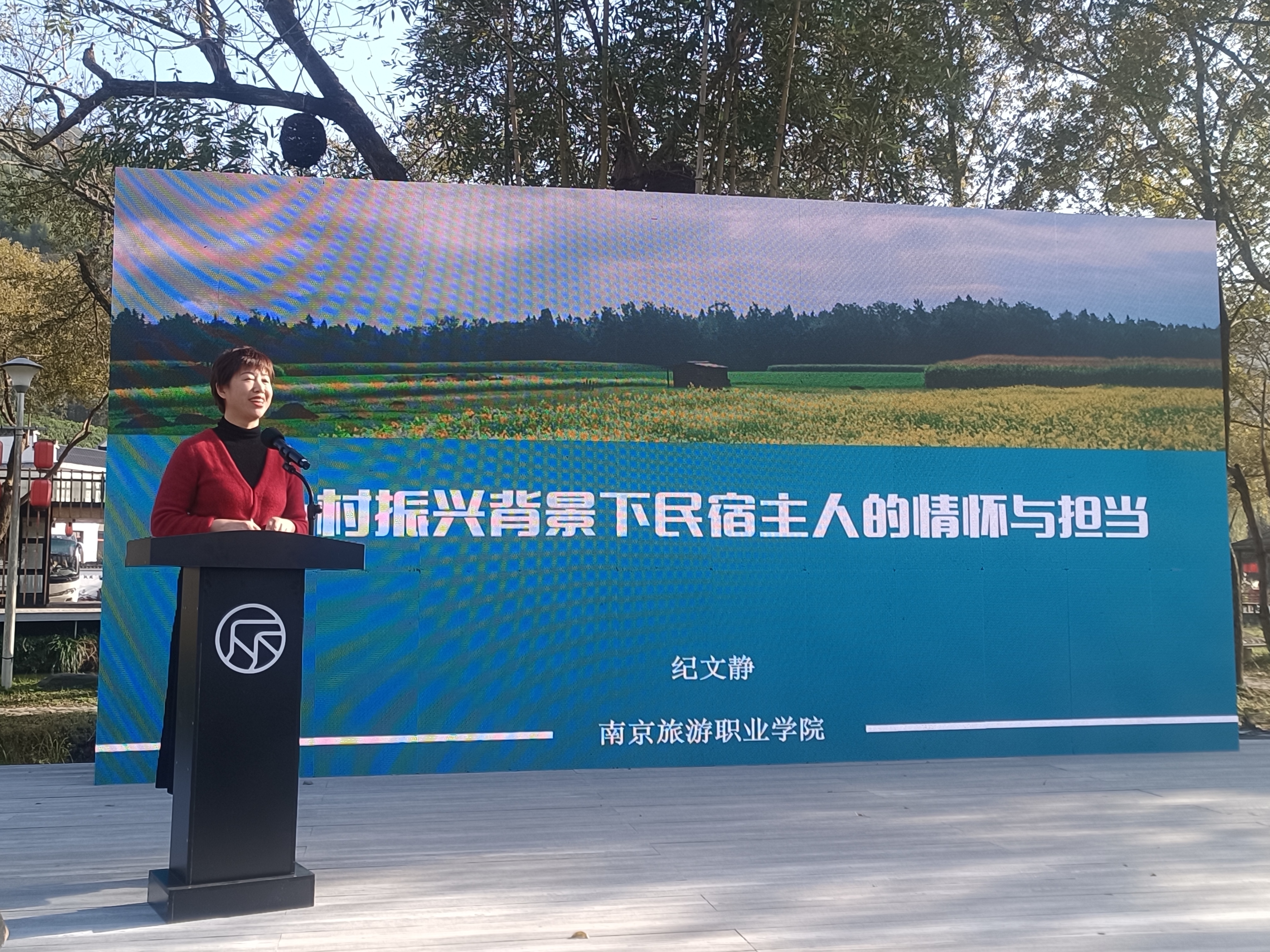 下午的“我为家乡代言”旅游职业教育促进乡村振兴论坛在风景秀美的黄山区焦村镇汤家庄村举行,邀请了长三角地区旅游职业院校及行业的专家参会,旨在推动长三角旅游职教联盟单位紧密合作、互学互鉴、提质增效。论坛上,纪文静老师做了题为《乡村振兴背景下民宿主人的情怀与担当》的精彩分享,获得全场热烈掌声。