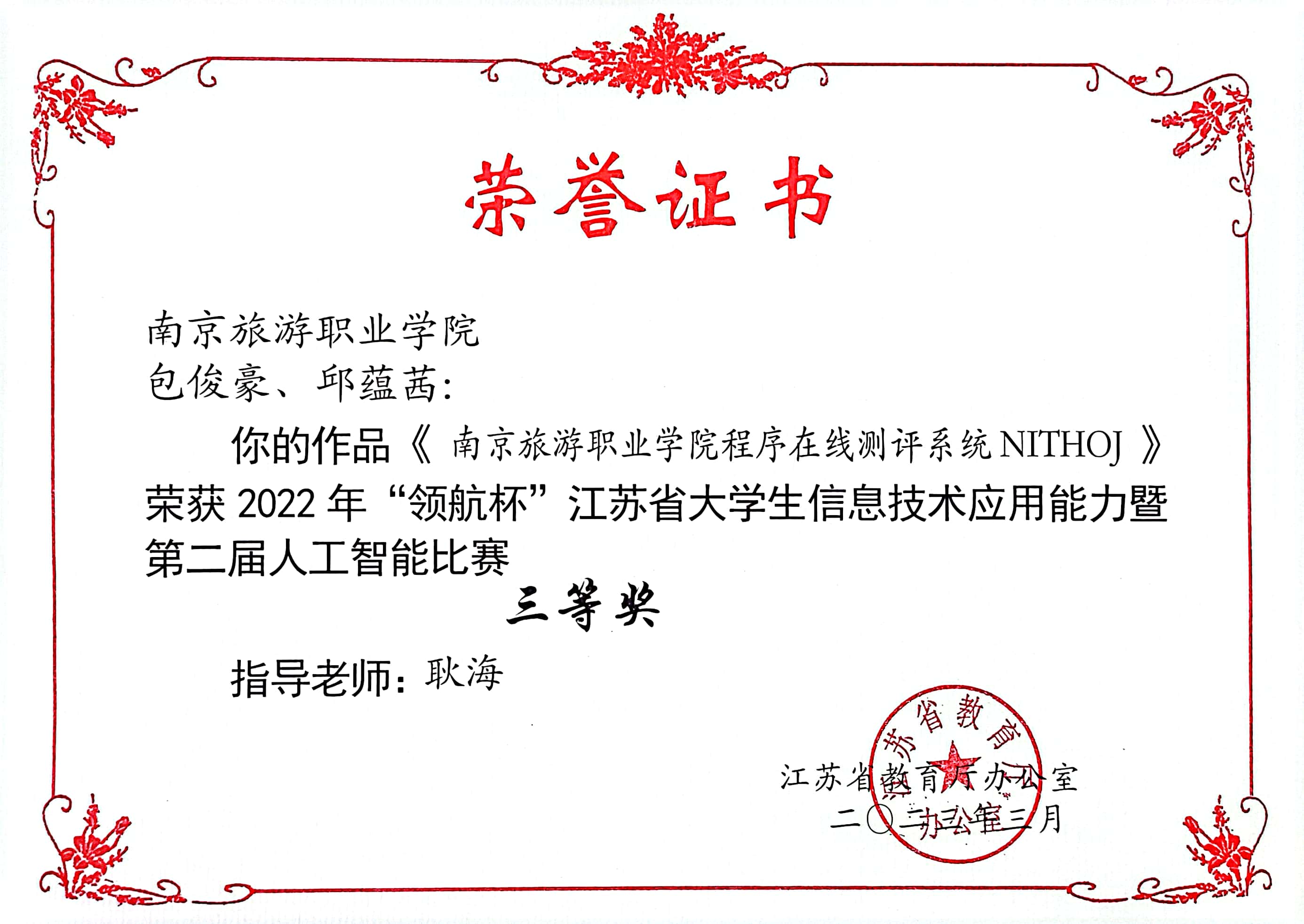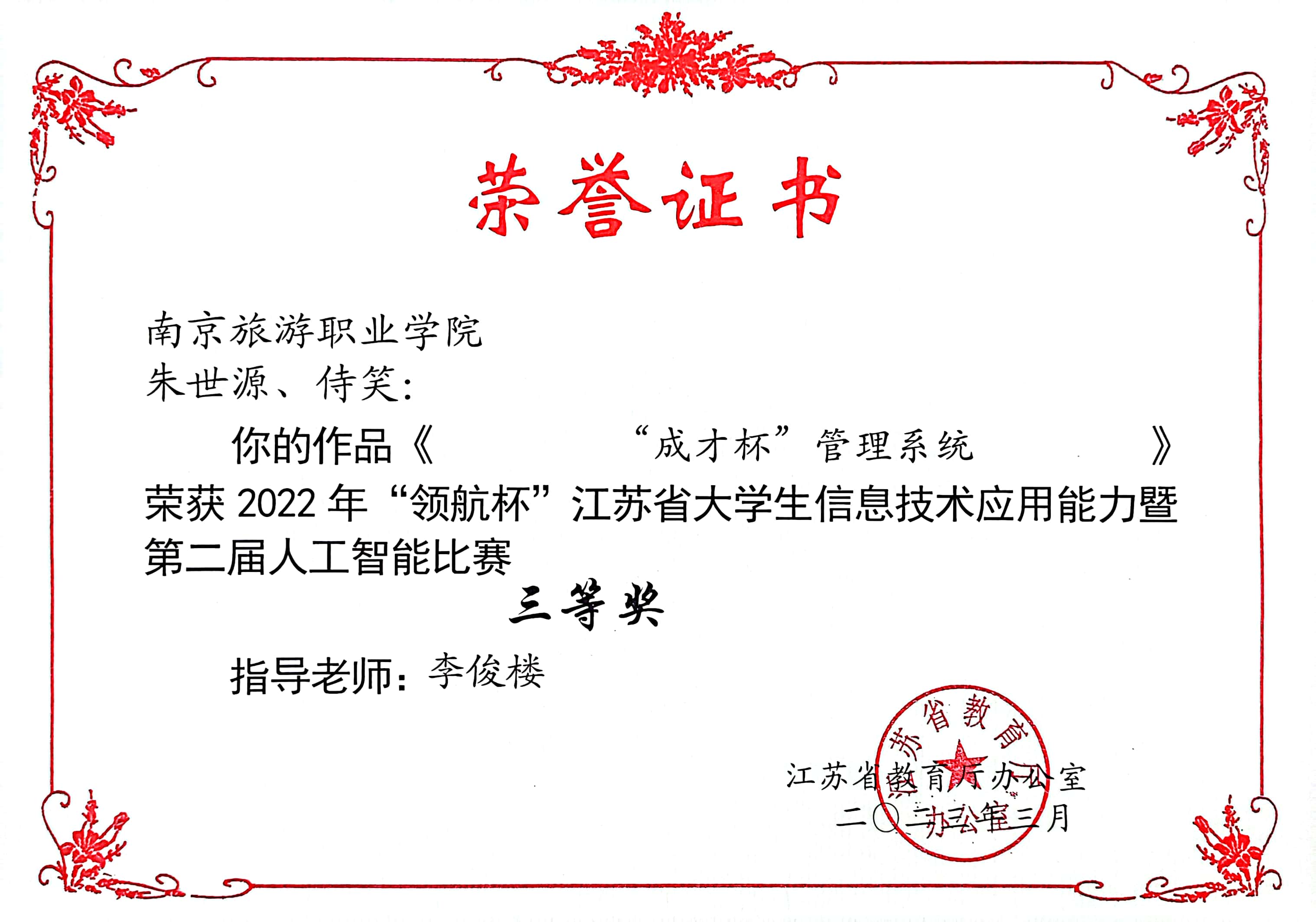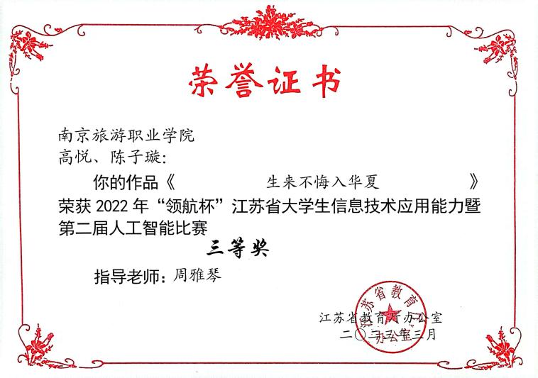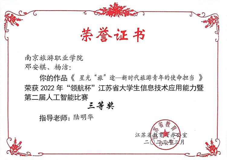 近日,江苏省高等学校教育信息化研究会公布了2022年“领航杯”江苏省大学生信息技术应用能力比赛暨第二届人工智能比赛获奖名单,我院喜获二等奖1项,三等奖4项,获奖总数再创新高。由我院谭卿敏老师指导的《穆小凡升学记——我的职教之路》获微视频作品二等奖,由陆明华老师指导的《星光“旅”途——新时代旅游青年的使命担当》、周雅琴老师指导的《生来不悔入华夏》获微视频作品三等奖,李俊楼老师指导的《“成才杯”管理系统》、耿海老师指导的《南京旅游职业学院程序在线测评系统NITHOJ》获软件开发作品三等奖。