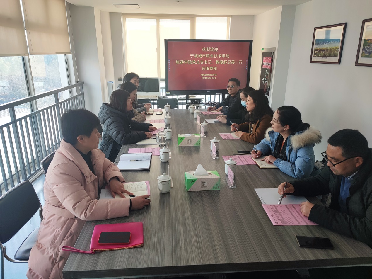 2月15日下午,宁波城市职业技术学院旅游学院党总支书记舒卫英,旅游学院酒店专业主任穆亚君,旅游学院旅游管理专业主任陈俊,旅游学院科研平台负责人朱岚涛,旅游学院研学旅行专业负责人鲍文君一行来我院参观交流。南京旅游职业学院党委委员、副院长操阳,教务处副处长张维国,酒店管理学院副院长姜华,旅游管理学院副院长丁洁,人文艺术学院副院长沈征参加了此次交流会。