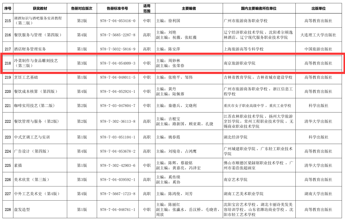 日前,我校在首届全国教材建设奖评选中传来捷报,根据教育部7月2日网站公示通知,我院樊平副教授主编的《餐饮服务与管理》(第二版)成功获得全国优秀教材(职业教育与继续教育类)一等奖,周妙林教授、张荣春副教授编写的《冷菜制作与食品雕刻技艺》(第三版)成功获得全国优秀教材(职业教育与继续教育类)二等奖。