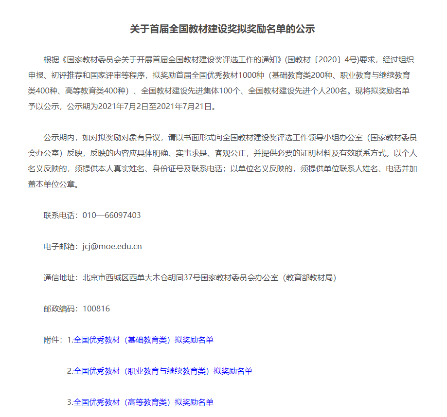 全国教材建设奖由国家教材委员会主办、教育部承办,每四年评选一次,是落实习近平总书记关于教材建设的重要指示精神,是展示党的十八大以来教材建设成就的重要平台,旨在对各级各类优秀教材予以表彰,立足强导向、建机制、促建设,充分调动各方面的积极性,带动教材建设质量整体提升。2020年开展的首届全国教材建设奖评选是新中国成立以来首次设立全面覆盖教材建设各领域的专门奖励项目,也是全国教材建设领域的最高奖。