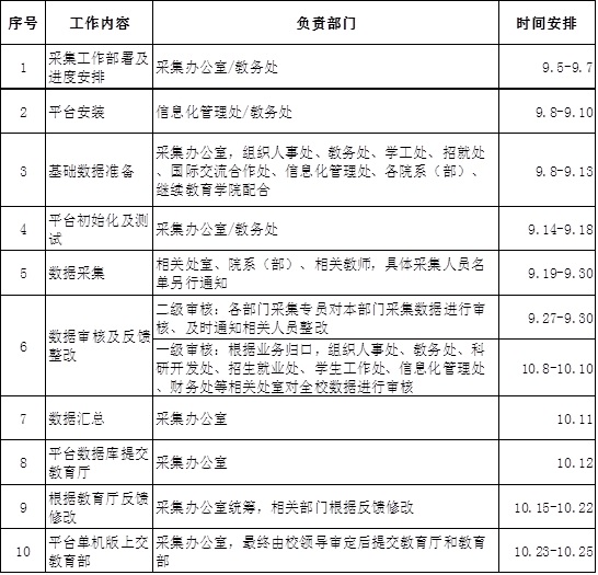 按照上级管理部门要求,结合我院情况,2019年学校数据采集各项工作进度及时间安排如下。