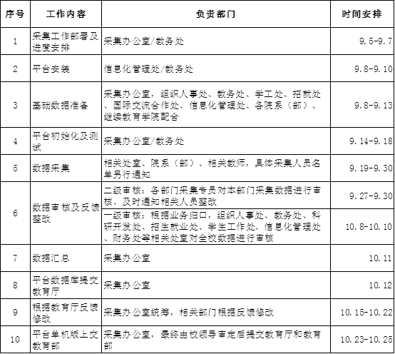 数据采集工作时间紧,任务重,请各部门高度重视,严格按照工作进度安排,在规定时间完成所有采集工作。