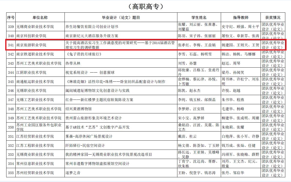 近日,从江苏省教育厅传出喜讯,我校姚建园、王则天、王贺三位老师指导的团队毕业设计(论文)《关于提高酒店实习生工作满意度的对策研究——基于2014届酒店管理实习生的调研数据》(张孝红、李梅、王益娟)被评为2017年江苏省普通高校团队优秀毕业设计(论文)。这是我校第一次参加省级团队优秀毕业设计(论文)评选,并获得佳绩。