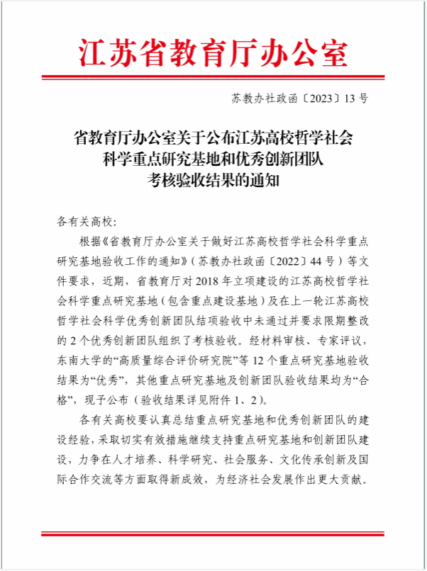 近期,江苏省教育厅对40家江苏高校哲学社会科学重点研究(建设)基地进行了考核验收,验收过程包括材料审核、专家评议等环节,主要针对各研究(建设)基地软硬件基础设施建设、人才培养、科学研究、社会服务及学术交流等方面进行了量化考核。我院江苏旅游文化研究院顺利通过考核验收。