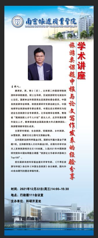 为进一步提高我院教师尤其是青年教师课题申报和学术论文写作质量,提升我院科研整体实力,12月22日下午,科研开发处特邀请北京第二外国语学院旅游科学学院唐承财博士(后)、教授线上做了题为“旅游类课题申报与论文发表的经验分享”专题讲座,来自酒店管理学院、旅游管理学院、人文艺术学院、烹饪与营养学院的30多名教师在行政楼111室听取了本次讲座,讲座由科研开发处处长邸平伟教授主持。 讲座内容为两部分,第一部分,浅谈旅游科研课题申请的道与术。第二部分,论文写作经验分享。唐教授结合自身申报国家自然科学基金和教育部人文社科课题成功立项案例就旅游科研项目申报选题、课题申请书撰写、课题申报的新变化等方面作了系统讲解,强调了应注意的选题原则、选题要点,特别提出我们的老师选题时要关注“乡村振兴”“双碳”“新冠疫情”等热点,归纳了“十四五”管理科学部优先发展的十几个领域,并叮嘱大家申报各类课题要提前下手、早准备、多打磨、多咨询高手前辈,打好科学研究的基础。在第二部分内容中,唐教授结合自己发表文章的经验和担任多家杂志匿名审稿专家的经历分享了非常有指导性的论文写作与发表的技巧和方法。 唐教授科研成果丰硕,且科研成果质量高、影响力大,入选2021年中国旅游研究院和中国知网联合课题“旅游论文作者学术影响力Top100”,而且又担任多个有影响力杂志的匿名评审专家,所以他的讲座很有指导性,老师们都觉得受益良多,大家期待下次有机会能在线下与唐教授面对面交流。