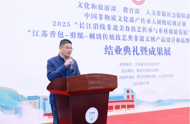 11月6日上午,由文化和旅游部、教育部、人力资源社会保障部联合实施的“中国非物质文化遗产传承人研修培训计划”——2025年“长江沿线中餐烹饪技艺传承与乡村旅游发展”暨“江苏香包、剪纸、刺绣传统技艺类非遗文创产品设计和品牌营销”研修班结业典礼在我院飞燕广场隆重举行。江苏省文化和旅游厅非遗处副处长孔叶萍、江苏省戏剧学校党委委员、副校长周黛瑜,南京旅游职业学院党委书记叶凌波、副院长洪涛等领导出席典礼。典礼由科研开发处副处长张宁主持。