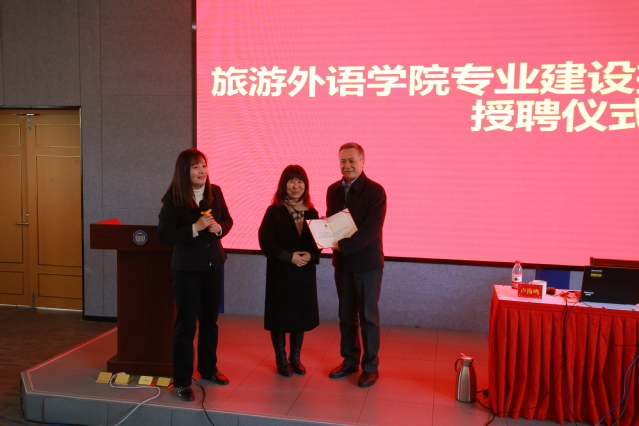 为凝聚专家智慧,更好地为学院专业发展建言献策,切实加强以文育人、以文化人,旅游外语学院有幸邀请南京出版传媒集团总经理、党委副书记,南京出版社社长卢海鸣担专业建设指导委员会顾问一职。2022年11月15日,受聘仪式在教学楼报告厅举行。南京旅游职业学院副院长操阳、旅游外语学院院长邵华出席仪式现场,仪式由旅游外语学院副院长姚瑶主持。在与会领导和教师、学生们的见证下,操阳副院长为卢海鸣颁发了聘书。
