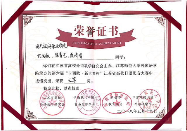 2018年5月19日,国际旅游系日韩西教研室主任吕晋老师,葛燕老师带领旅游日语专业的陈晋艺,武雨薇与桑梓清3位学生前往江苏师范大学(徐州)参加了第六届“卡西欧·新世界杯”江苏省高校日语配音大赛。 此大赛由中国日语教学研究会主办,卡西欧有限公司和新世界日语教育协办,是面向江苏省内日语专业学生的一大赛事,每年都吸引了省内众多本科院校参加。