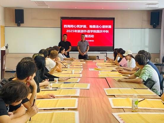 为弘扬中华优秀传统文化,促进中外学生文化交流,10月8日,旅游外语学院在学生社区会议室举办了以“四海同心筑梦圆,翰墨连心谱新篇”为主题的国庆中秋文化活动。学院党总支书记陈海艳、党总支副书记卢淳、辅导员叶斯哈提老师共同参加了活动。来自哈萨克斯坦的留学生及少数民族学生40余人共同在墨香中感受中国书法的独特魅力,度过了一段充实而有意义的假期时光。