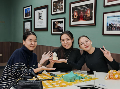 “瓷器挖宝”环节是一派“考古发掘”的热闹景象。留学生们手持小工具,全神贯注地敲击着石膏盲盒,体验着探索未知的乐趣。随着石膏碎屑被一点点扫去,一个个玲珑小巧、纹饰精美的迷你瓷器终于“破土而出”。同学们惊喜地又小心地将瓷器捧在手心,仔细端详,听教师双语讲解瓷器文化内涵,并学习中文讲法。这不仅是一次寻宝,更是一次与中国“瓷文化”和匠心故事的对话。随后,留学生们将亲手挖出的瓷器郑重地放入“中国瓷器微型博物馆”展示柜,在郑重的仪式感中成为这件瓷器的守护者。