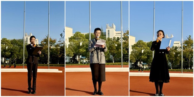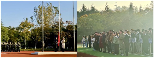 国旗护卫队步伐整齐,在有力的脚步声中护卫五星红旗入场。伴随激昂国歌,五星红旗冉冉升起,全体师生满怀豪情向国旗行注目礼。