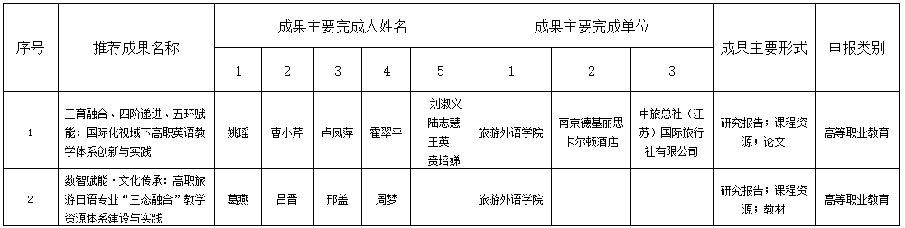 根据《关于开展南京旅游职业学院2025年校级教学成果奖申报工作的通知》(南旅教办〔2025〕4号)文件要求,经团队申报、部门评审,拟推荐2项成果参评校级教学成果奖。现将该成果主要信息予以公示:
