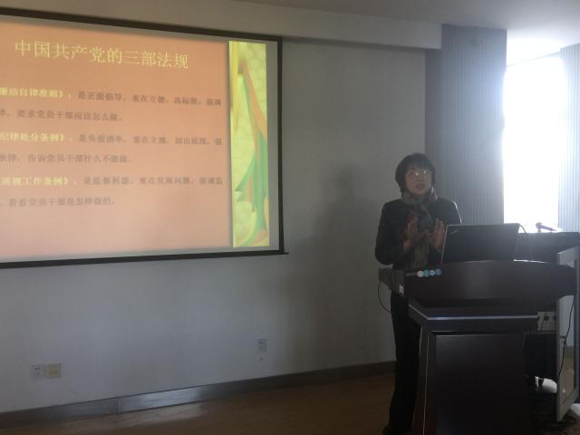 11月3日下午,党总支书记樊平同志在全体党员大会上讲授了题为“做守纪律、懂规矩的共产党员”专题党课。全体党员参加了党课学习。 党课紧扣“两学一做”学习教育主题,结合学习材料《中国共产党廉洁自律准则》、《中国共产党纪律处分条例》,有针对性地了解学习了党员不守纪律、不讲规矩的危害、中国共产党的三部法规、“八项规定”、“六项禁令”。深刻分析了作为一名党员,不守纪律、不讲规矩不仅仅损害党的形象,削弱党的力量,同时更会恶化政治生态。同时,重新认识中国共产党的三部法规,从我做起,严以律己,更有新时代的必要性。强调充分体现纪法分开、纪在法前、纪严于法的《中国共产党廉洁自律准则》、《中国共产党纪律处分条例》、《中国共产党巡视工作条例》对于正确认识自我,做好一名高校教师不仅具有严格的束缚力,更具有时代的导向性。 书记讲党课活动的扎实开展,使广大党员干部思想上真正受到洗礼,提升了大家的政治理论水平,鼓舞了大家干事创业的决心斗志,增强了学习教育的针对性和实效性。全体党员一致认为,在今后的工作中要切实向模范党员标准看齐,坚定理想信念、严守规矩纪律、提升思想境界、立足岗位,锤炼作风、锐意进取。