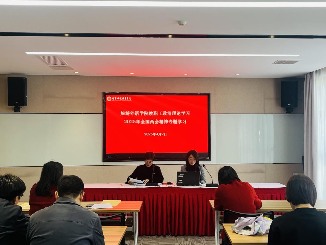 为深入学习全国两会精神,明确新时代教育工作者的使命担当,4月2日下午15:30,旅游外语学院在行政楼111会议室开展本年度第二次教职工政治理论学习。本次学习由党总支宣传委员霍翠平主持,学院领导班子及全体教职工参加。