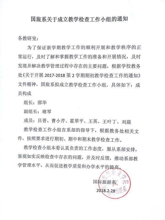 国旅系关于成立教学检查工作小组的通知