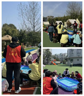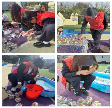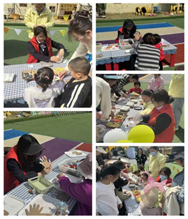 活动前期,志愿者们提前到场、分工协作,有序完成各项准备工作。围绕“食物拼拼乐”“故事绘”“字母小火车”“欢乐捞小鱼”“手指贴画”“沙土堆堆乐”六大主题环节,志愿者与幼儿园教师共同完成场地布置与道具准备,为活动顺利开展奠定了良好基础。