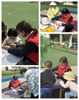 活动现场气氛温馨活跃、互动频繁。在“食物拼拼乐”环节,志愿者通过英文讲解水果名称,手把手指导孩子们制作酸奶碗,让孩子们在动手实践中自然感知英语表达;在“故事绘”环节,志愿者以生动的语言讲述趣味英文故事,引导孩子们在倾听中激发兴趣、拓展想象;在“字母小火车”环节,通过趣味教学引导孩子们认识英文字母,并完成贴图互动,在鼓励与奖励中增强参与感与成就感。此外,在“欢乐捞小鱼”“手指贴画”“沙土堆堆乐”等环节中,志愿者全程耐心陪伴、细致指导,既保障活动安全有序,也充分尊重孩子们的个体体验,让每一位孩子都能在参与中收获快乐。