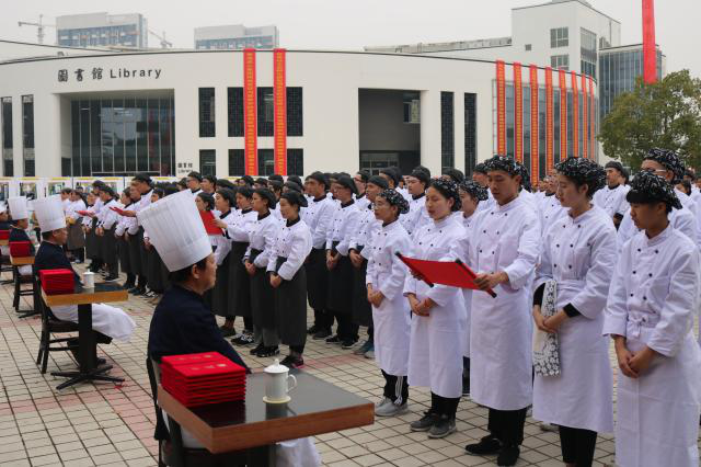 接着,校图书馆馆长张军作为司仪主持了拜师典礼。全体新生跟随司仪向各自的师傅读拜师帖,全体向师傅三鞠躬行礼,礼毕后徒弟代表向师傅敬茶。饮茶后,师傅读回师帖,向徒弟赠送回师帖。司仪宣布礼成。拜师典礼是我校现代学徒制改革推进的一大步,相信学徒们会在将来的学习、工作中努力跟随师傅的脚步,传承师傅的厨德厨艺,最终超越师傅,将中华烹饪的大国工匠精神发扬光大。