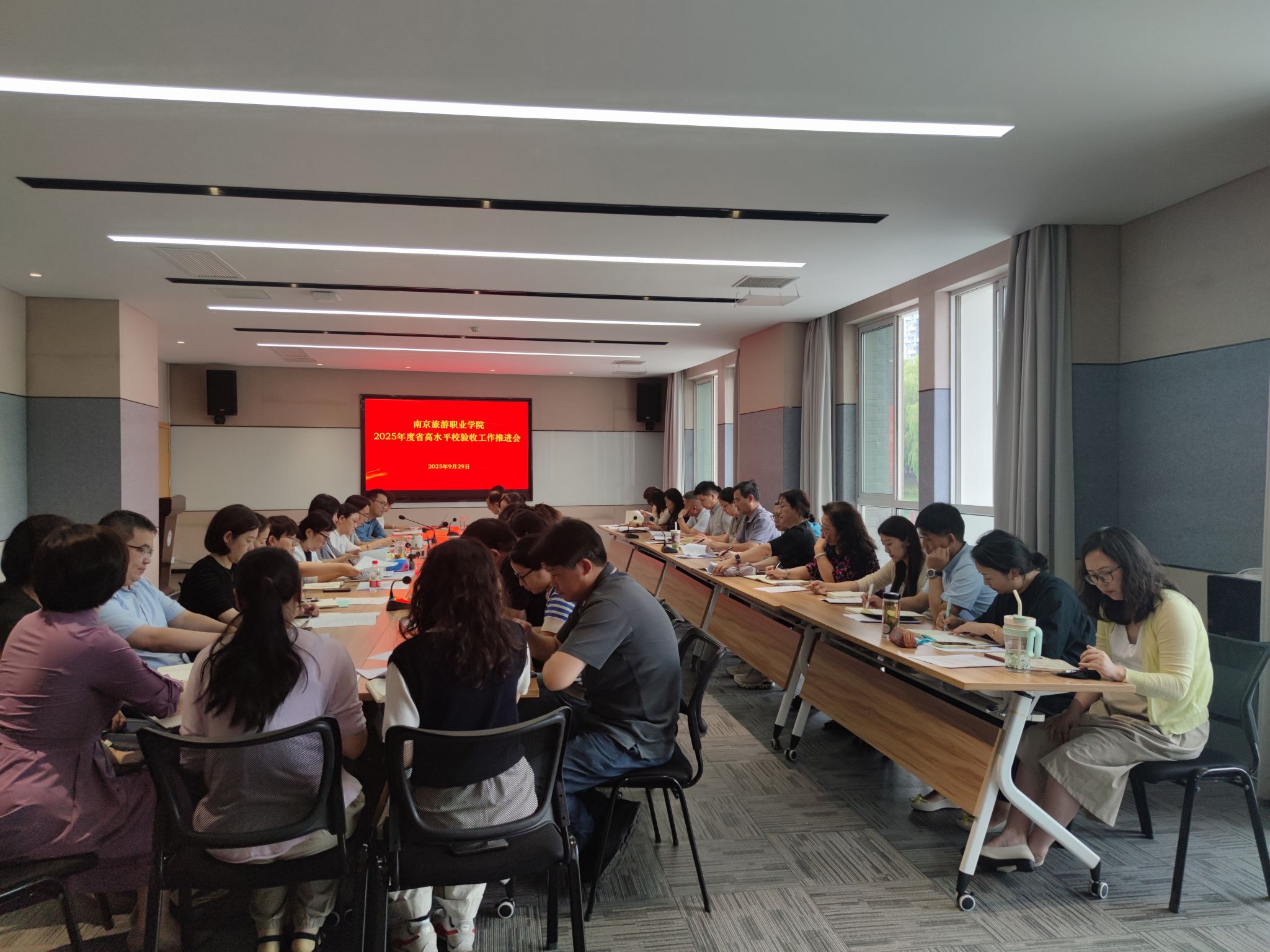 为加快推进省级高水平高职学校建设步伐,推动学院高质量内涵发展,9月29日,学院召开2025年度省高水平高职学校验收工作推进会。党委副书记、院长操阳,党委副书记朱琰,党委委员、副院长洪涛,党委委员、副院长张骏,各职能部门负责人、二级学院党政负责人及校办企业负责人参加会议。会议由规划发展处处长顾至欣主持。