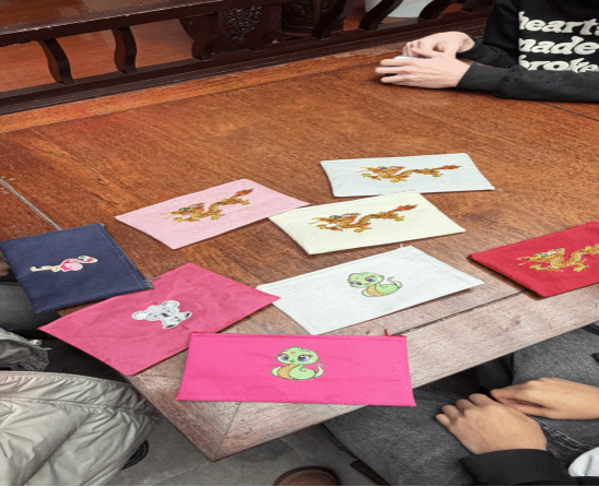 在老师的指导下,中外学子围坐在一起,穿针引线、凝神创作。大家屏气凝神、专注投入,原本浮躁的心情在丝线的穿梭中逐渐平复。中国学子主动向外国留学生分享刺绣文化内涵,外国留学生则好奇地交流创作心得,不同文化在指尖碰撞交融,现场氛围温馨融洽。