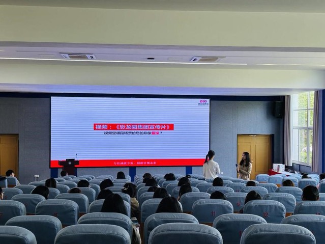 宣讲会上,常州恐龙园人力资源部经理党梦婷为同学们介绍了恐龙园集团的发展概况,并为同学们梳理了实习岗位和职业发展路径,鼓励同学们在今后的实习中锤炼旅游服务与管理技能,迅速成长为优秀旅游人才,并承诺公司会给每一位员工优厚的待遇和可持续发展的职业生涯。