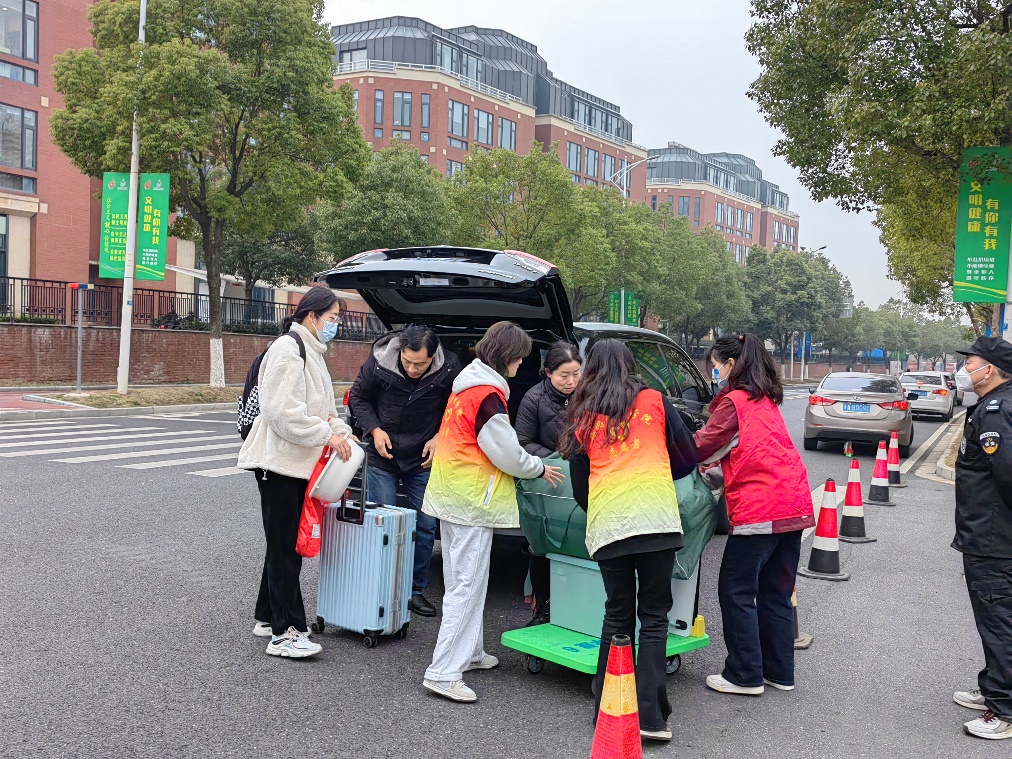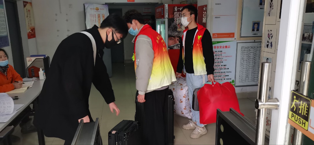 学院师生志愿者们早早到岗开展服务工作,以饱满热情的态度迎接同学们的到来。学生在校门口进行测温后有序地进入校园,穿着红马甲的志愿者穿梭在校园的各个角落,为同学们搬运行李,他们忙碌的身影为校园增添了生机与活力,也让返校的同学心中倍感温暖。
