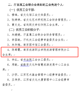 在本次表彰中,旅游管理学院分工会被评为“先进职工小家”,我院共3个分工会获此殊荣。分工会陈菊霞同志受厅直属工会联合会表彰为“优秀工会积极分子,我院仅2人获得。
