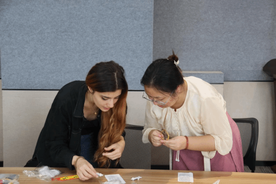活动伊始,手工社社长潘悦晗简要介绍了掐丝珐琅(又称“景泰蓝”)的历史渊源与艺术特点。这项被誉为“一件景泰蓝,十箱官窑器”的非遗技艺,以复杂工序、绚丽色彩和精湛技艺闻名,让留学生产生浓厚兴趣。手工社成员化身“小老师”,指导留学生完成金丝掐制、图案粘贴、釉料填充等关键步骤。尽管初期操作生疏,但在耐心指导下,大家逐渐掌握技巧,专注地用镊子弯曲金丝、调配釉色,沉浸在创作中。