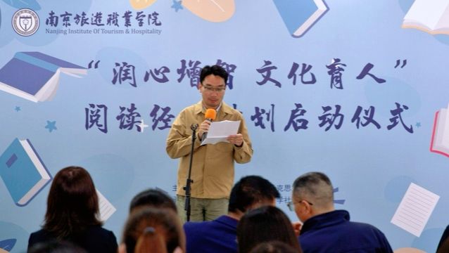 张骏在致辞中指出,南京旅游职业学院多年来致力于书香校园建设工作,提高阅读活动质量,营造“爱读书、读好书、善读书”的校园学习氛围。他呼吁同学们与书为伴,博览群书,深读经典,让—缕书香伴大家同行。