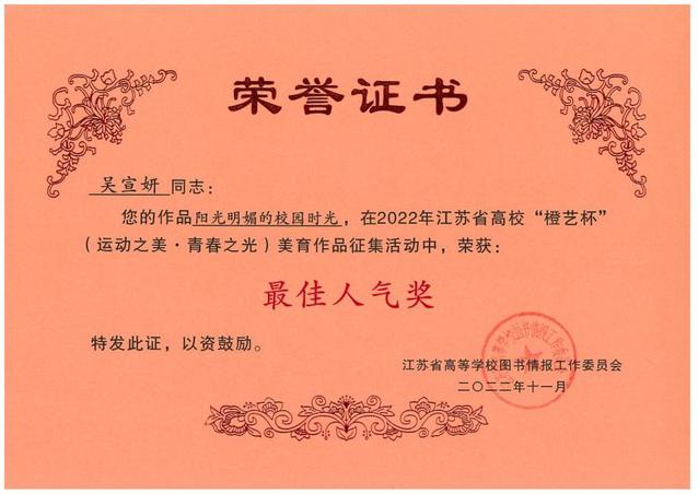 为弘扬中华美育精神和体育精神,响应中共中央办公厅、国务院办公厅《关于全面加强和改进新时代学校美育工作的意见》、教育部《关于切实加强新时代高等学校美育工作的意见》等文件精神,江苏省高校图工委读者服务与阅读推广专业委员会开展了2022年江苏省高校“橙艺杯”运动之美、青春之光·美育作品征集活动。