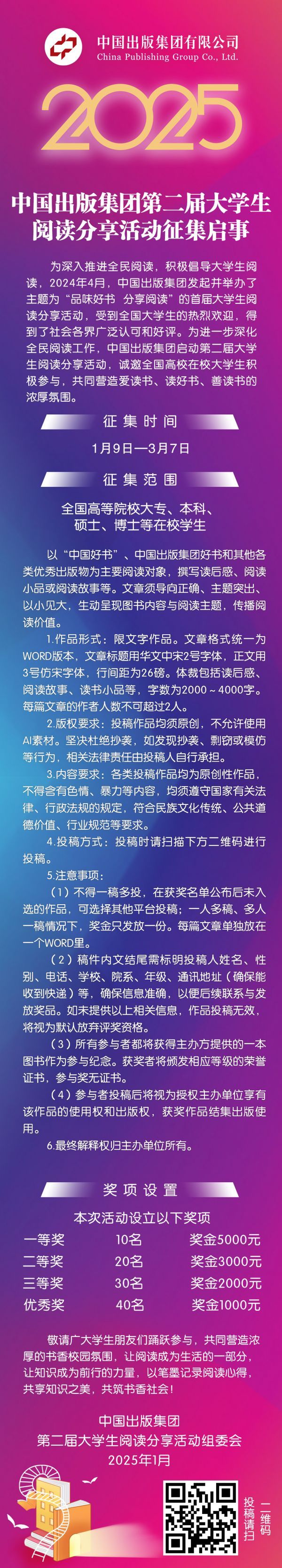 为进一步深化全民阅读工作,中国出版集团于2025年1月9日正式启动第二届大学生阅读分享活动,诚邀全国高校在校大学生积极参与,共同营造爱读书、读好书、善读书的浓厚氛围。欢迎踊跃投稿!